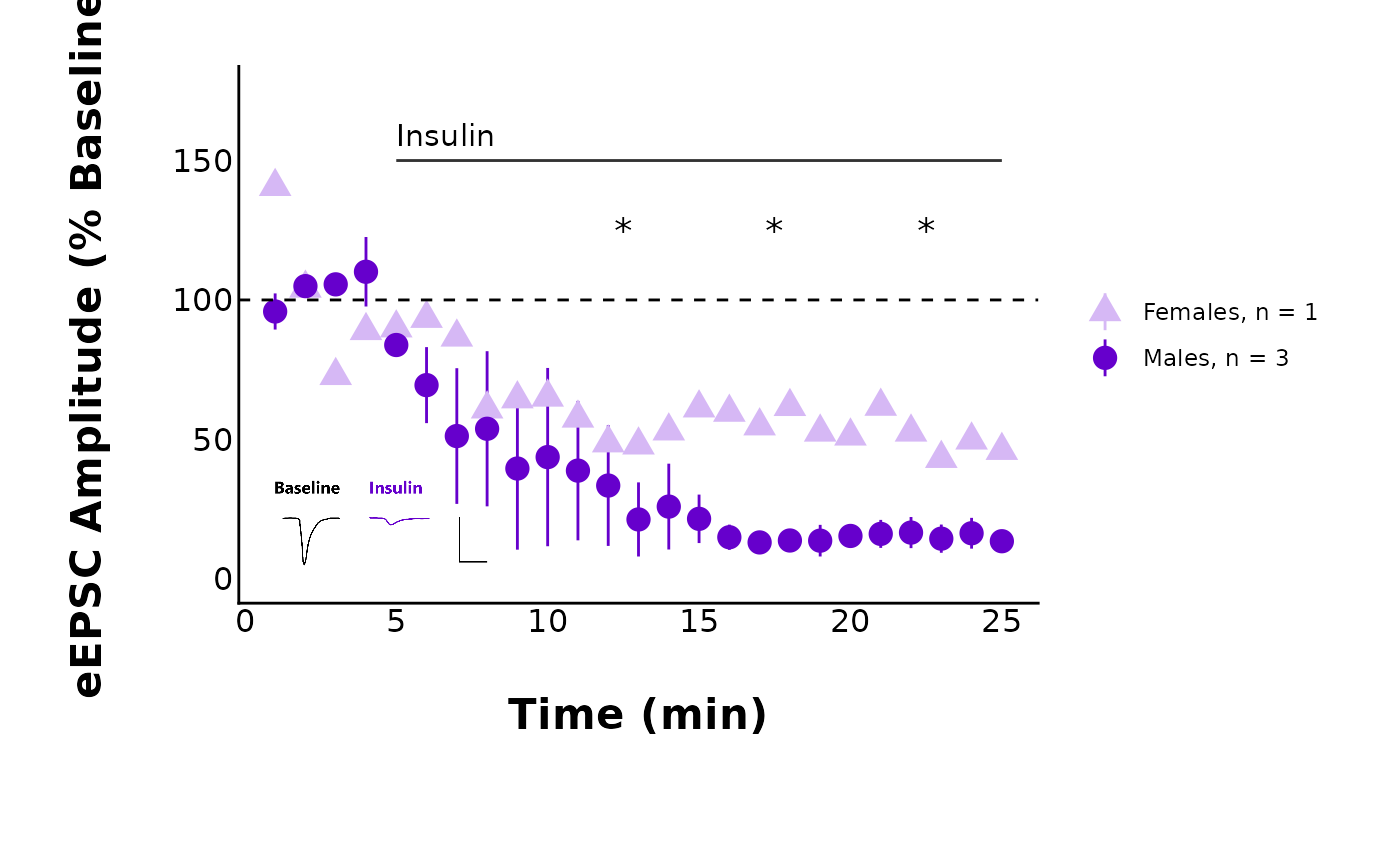 This function enables you to create a scatterplot of mean evoked (or spontaneous) current amplitude over over time in minutes. The data are summarized by treatment and sex, and averaged per minute. The data are presented as mean +/- the standard error.